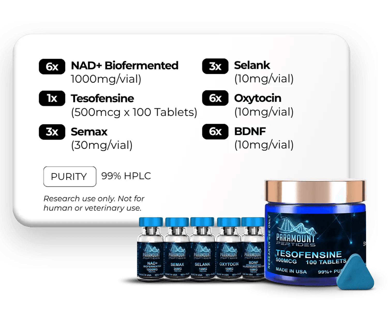 NAD+ Biofermented (1000mg), Tesofensine (500mcg x 30 Tablets), Semax (30mg), Selank (10mg), Oxytocin (10mg), BDNF (Brain-derived neurotrophic factor) (10mg)