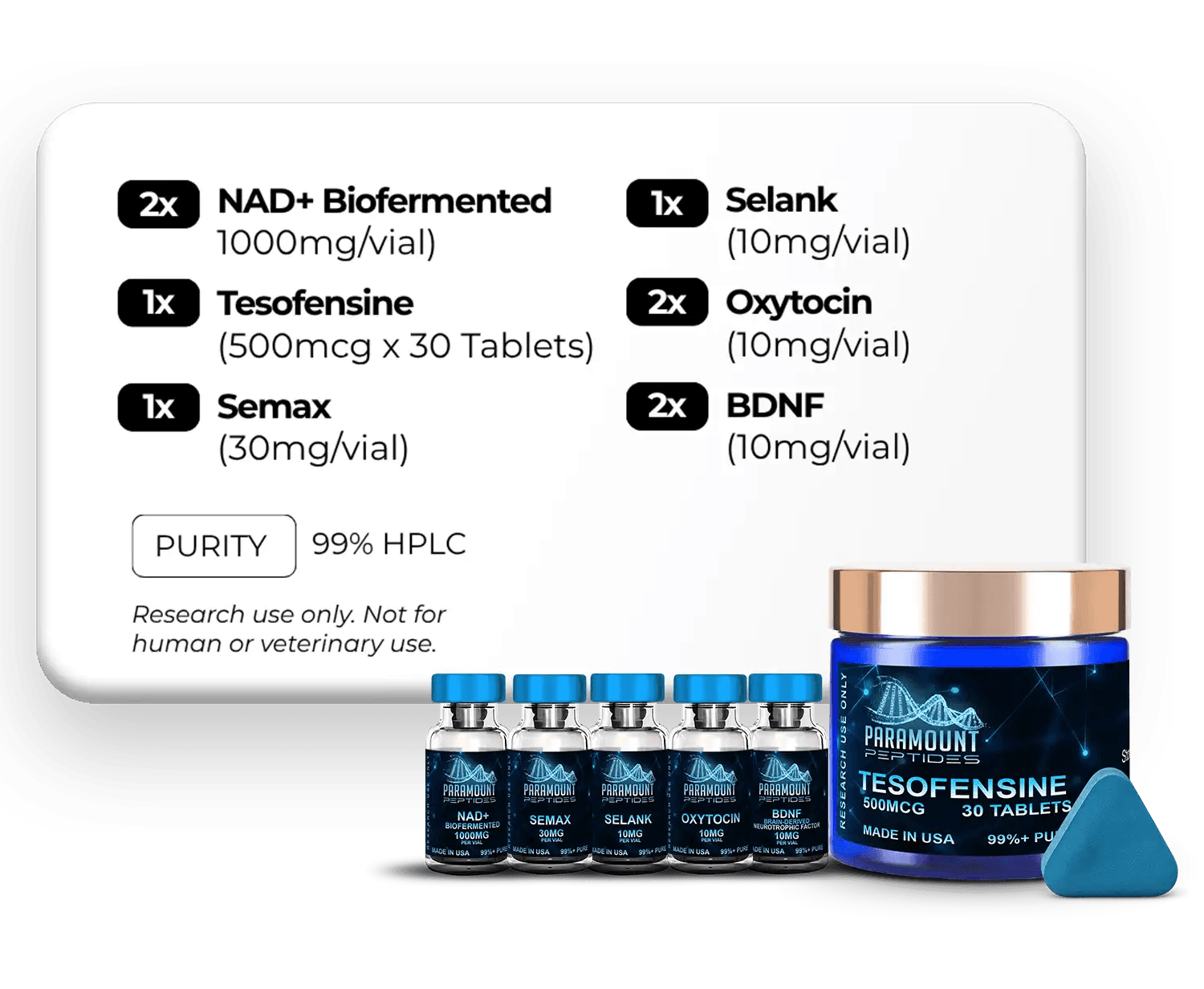 NAD+ Biofermented (1000mg), Tesofensine (500mcg x 30 Tablets), Semax (30mg), Selank (10mg), Oxytocin (10mg), BDNF (Brain-derived neurotrophic factor) (10mg)